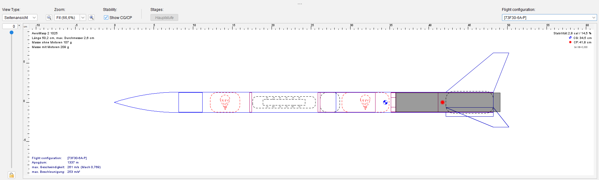 schon länger beschäftige ich mich mit dem Gedanken, eine Rakete zu bauen, die 1 km Flughöhe erreicht. Tatsächlich habe ich die Rakete mit dem Namen AeroWasp 2 auch schon gebaut und beim Nikolaunch dieses Jahr auf einem B4-4 gestartet (auf 125 m Höhe laut OpenRocket, ohne Elektronik). Ein kurzer Überblick über meinen bisherigen Plan: